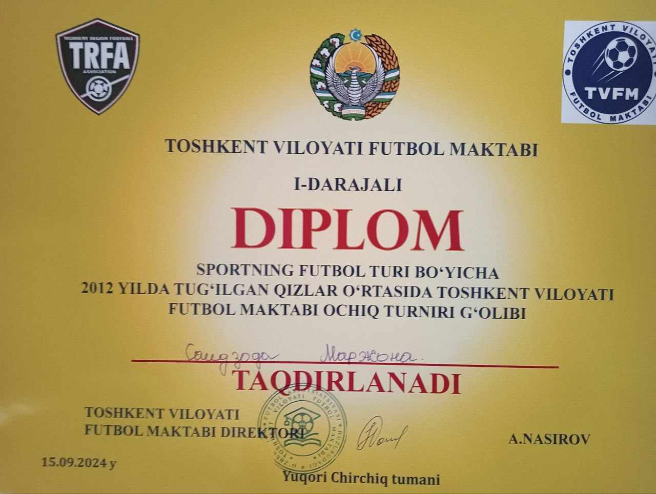 Saidzade Marjona sportning futbol turi bo'yicha 1 o'rinni qo'lga kiritdi